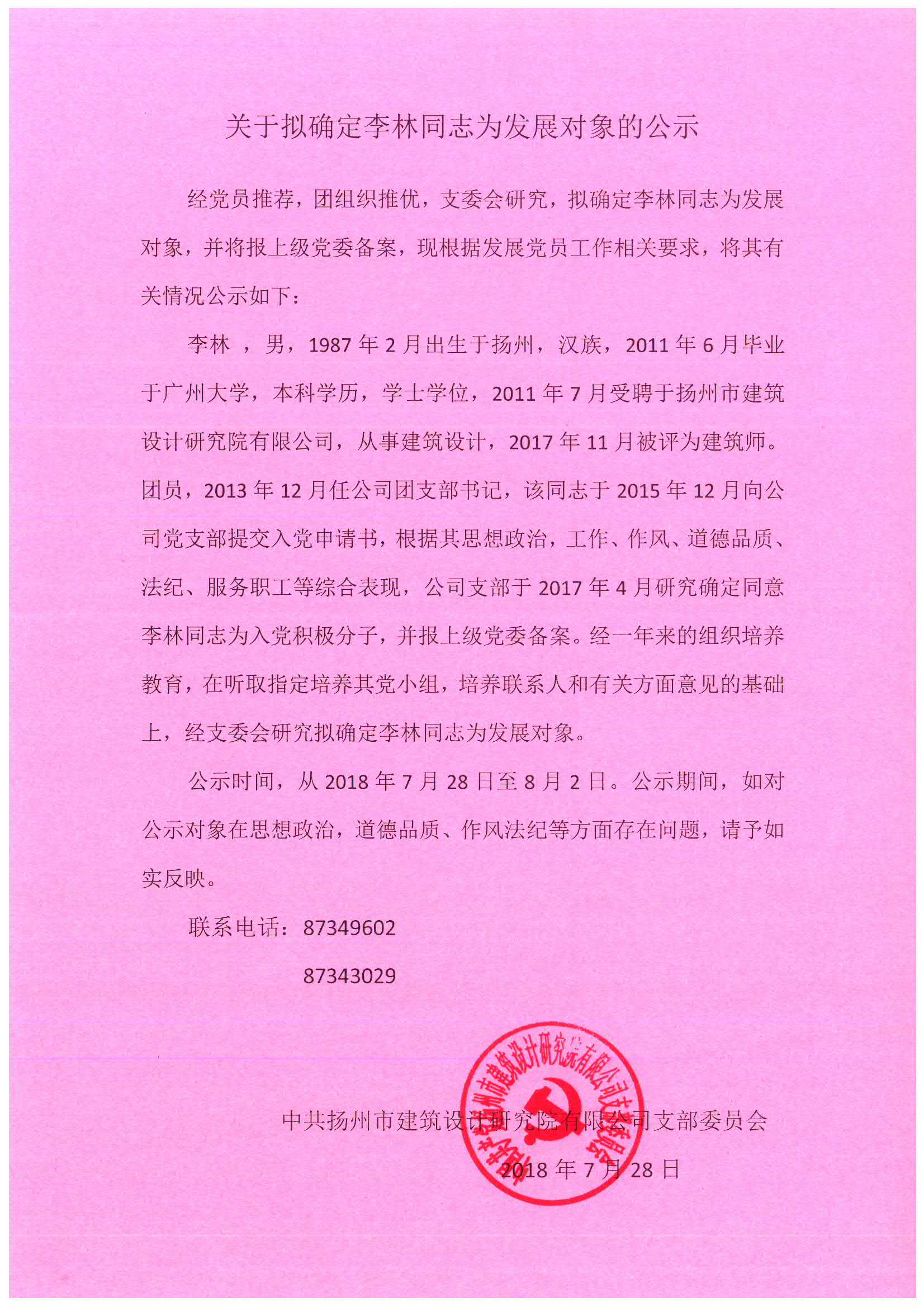 ·關(guān)于擬確定李林同志為發(fā)展對(duì)象的公示 [2018-07-28]